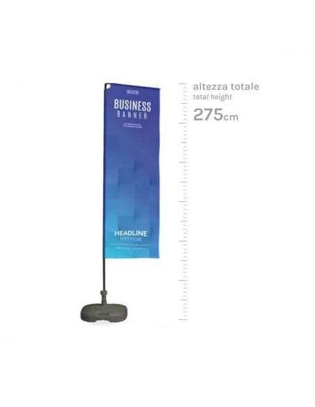 asta allungabile fino a 2,75 metri di altezza, alla sommità superiore dell’asta porta bandiera si colloca il traversino orizzontale. In dotazione viene fornita la base in plastica antracite (riempita con acqua raggiunge i 13,5 kg – se riempita con sabbia il peso aumenta).