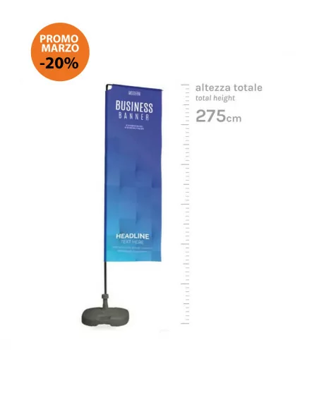Le bandiere pubblicitarie sono degli strumenti fondamentali nell'ambito della comunicazione visiva commerciale. Guardandosi intorno nella quotidianità di tutti i giorni è possibile capire come queste soluzioni espositive siano attuali, versatili e sempre più gettonate da chi ha la necessità di promuovere i propri prodotti, brand, servizi ecc. Se collocate all'aperto il vento contribuisce ad attirare l'attenzione del pubblico tramite il movimento della bandiera che già di per sé garantisce un notevole impatto visivo grazie anche a formati importanti (si va da bandiere con altezze sotto ai 2 metri a soluzioni di ben 12 metri). Questi espositori valorizzano inoltre il messaggio pubblicitario per mezzo di forme originali che non passano inosservate (squadrate, a goccia, a vela, triangolari ecc). Eolo Small è la bandiera che presenta le dimensioni più contenute tra tutti i modelli Eolo. Con la sua tradizionale forma squadrata è comunque caratterizzata da un'ampia area di stampa per la personalizzazione grafica della bandiera.Le nostre strutture portabandiera (Eolo, Eolo Big, Goccia1, Goccia2, Pitagora, Maxivela, Vela ecc.) sono pensate prevalentemente per eventi, come fiere ed esposizioni, grazie alla facilità di trasporto che le contraddistingue. Possono comunque essere utilizzate in ambienti outdoor essendo robuste e zavorrabili, si consiglia tuttavia di ritirarle in caso di condizioni meteorologiche particolarmente avverse. Solo i pennoni infatti possono essere collocati permanentemente all'esterno, anche in caso condizioni estreme, in quanto sono dei pali porta bandiera con ancoraggio al suolo in apposito basamento di cemento armato.