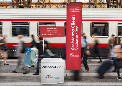 Bandiere Eolo Deluxe L realizzate per Trenitalia insieme a banchetti pubblicitari Desk Promoter. Queste soluzioni espositive sono state allestite presso le stazioni di Roma Tiburtina e Roma Termini, oltre che in numerose stazioni ferroviarie in altre regioni.
