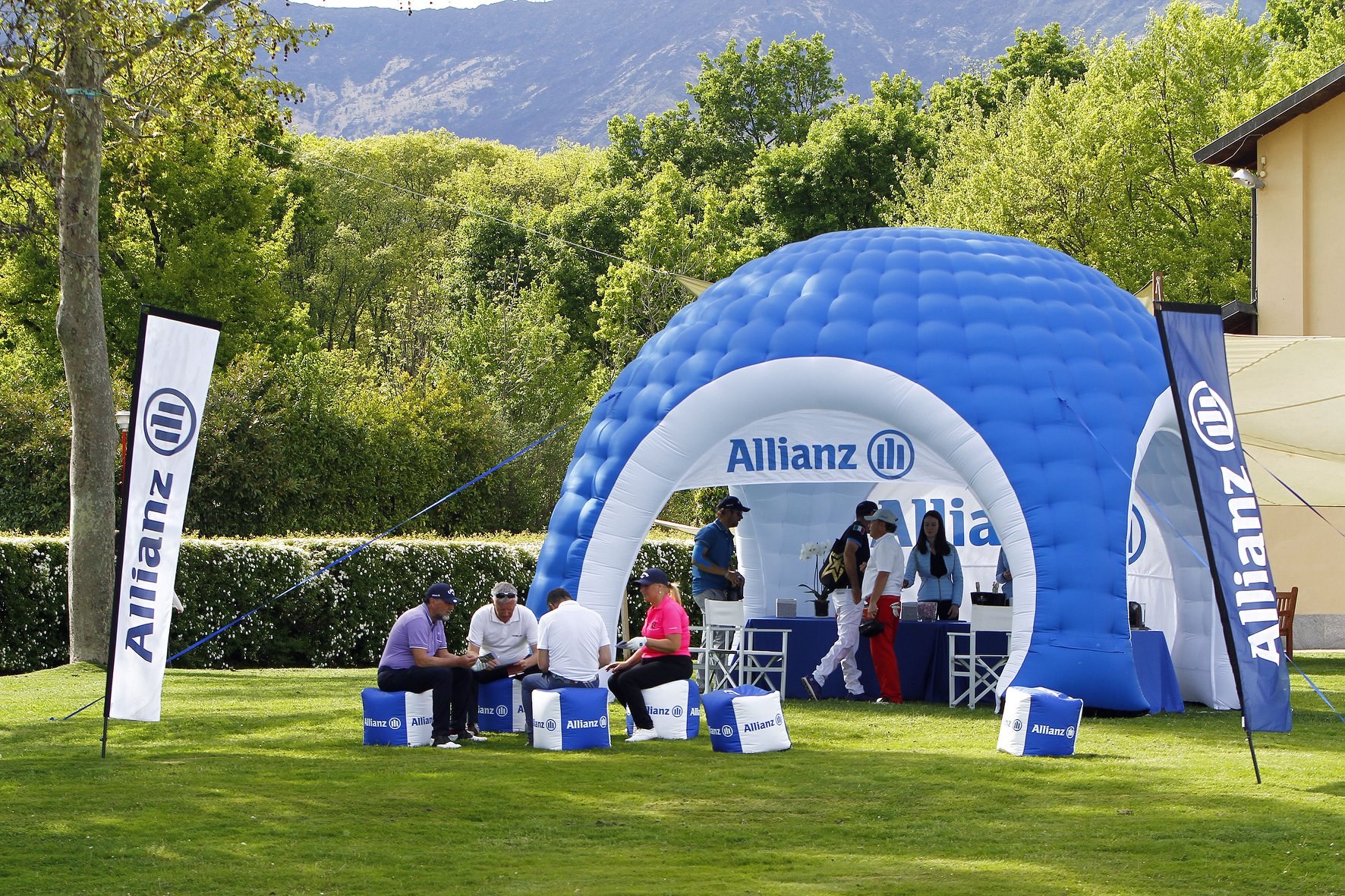 E' possibile acquistare questo stand portatile con teli neutri oppure interamente personalizzati, facilmente intercambiabili.Qui a fianco possiamo vedere il GAZEBO GONFIABILE realizzato per Allianz Assicurazioni, che ha scelto per la sua area espositiva outdoor una copertura personalizzata con grafica, accompagnato da bandiere Eolo, per un maggiore impatto visivo.