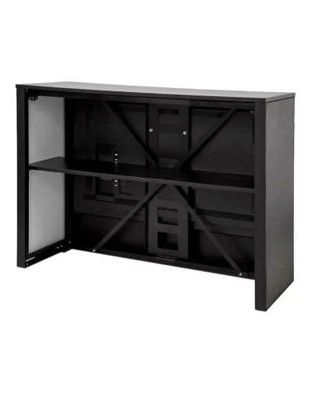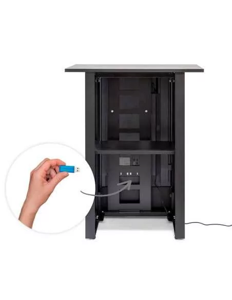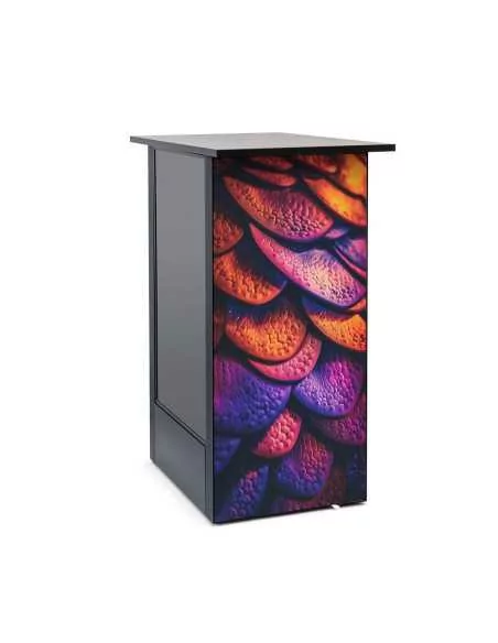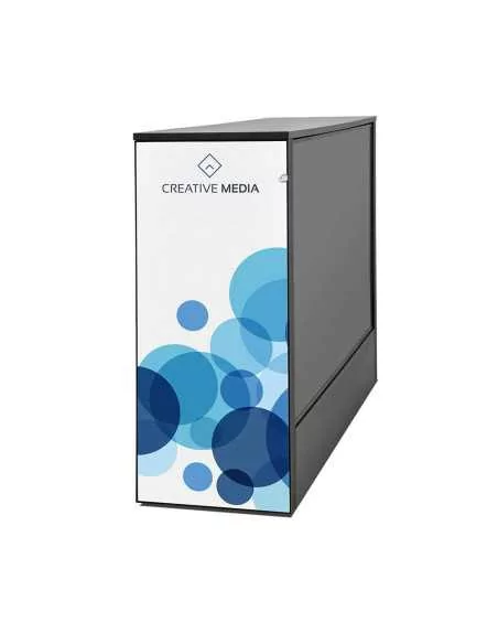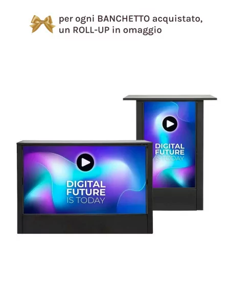Desk Futuro ha in dotazione un ripiano interno e due stampe di colore nero per rivestire i fianchi laterali della struttura. È naturalmente possibile personalizzare il banchetto digitale con la propria grafica preparando il file come da istruzioni (con la possibilità di cambiarla ogni volta che si vuole con un semplice gesto).