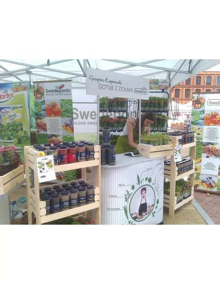 Robusto banchetto pubblicitario con top e ripiano in legno bianco. Telaio portante in alluminio, robusto (portata 100kg), facilmente richiudibile senza bisogno di attrezzi. Ingombro: cm 93x97x40,5 - 12kg