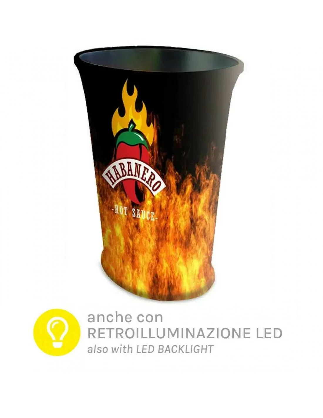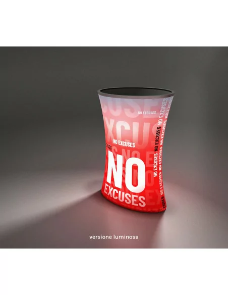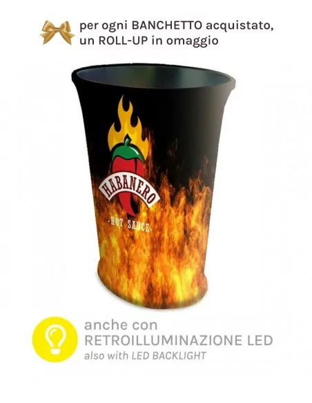 banchetto pubblicitario dal design accattivante e dalle dimensioni ridotte. Sistema di rivestimento della stampa innovativo, può essere utilizzato anche come base per l'esposizione dei prodotti. Borsa fornita. E’ possibile retroilluminare con LED il banchetto, contattateci per richiedere questa implementazione.