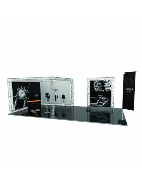 Stands "hi tech" made possible by a system of exposed aluminium trusses called "americana". The variety of components available allows adaptation to any type of equipment. It is installed with a minimum of manual skill thanks to the nuts and cockerels supplied.