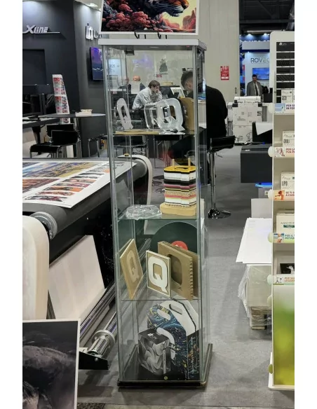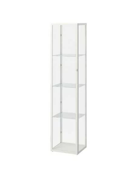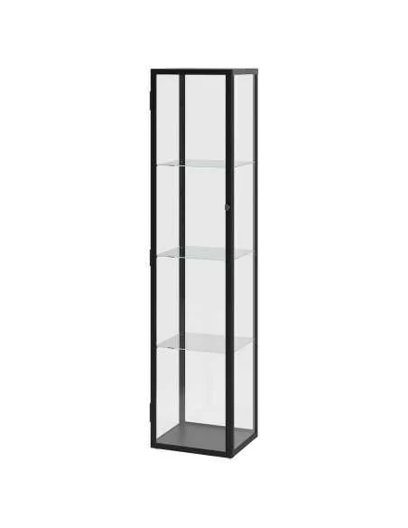 Display unit with glass shelves and closing walls (choice of white or black frame). Three adjustable glass shelves + lower base that can be used as an additional support surface.