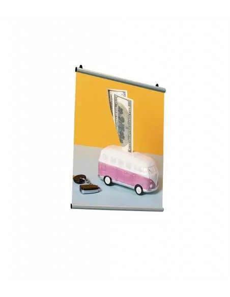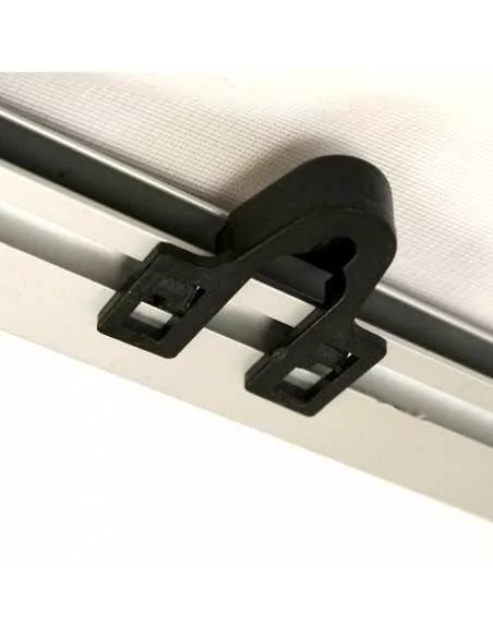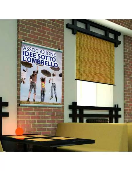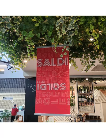 The Click Clack display has eyelets on the upper profile, which allow fixing by wall or hanging hooks, thanks to the use of cord cables (hooks and cables not included). Contact our sales department for more information on the suspension kit.