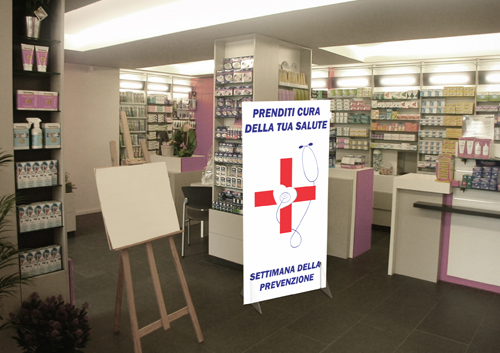 The Bardelli Brothers Pharmacy, province of Turin, together with other pharmacies in this area, displayed our Duplex pedestal, fitted with its printed panel, to advertise the Prevention Week, a yearly initiative by Assofarma Piemonte (Piedmont’s Pharmacists’ Association).