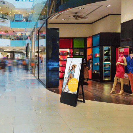 Digital whiteboard with the appearance of a high-tech advertising easel, equipped with a 43" Samsung monitor.