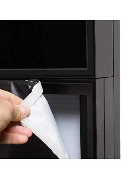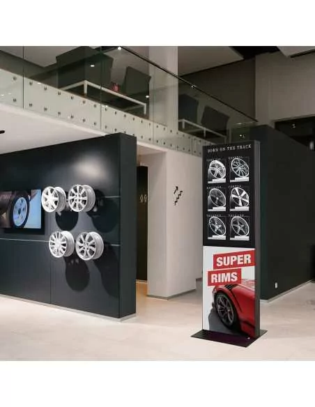 - Fabric version: Full graphic totem finished with perfectly tensioned fabric covering instead of the classic panels (black sheets are supplied which can be replaced later with customized sheets). In this mode we have a "lightened" structure but capable of further enhancing the message when prints with personalized graphics are added to the multimedia contents (to be placed on the front under the screen and full graphics on the back). These decorations are easy to interchange thanks to the ease of assembly.
