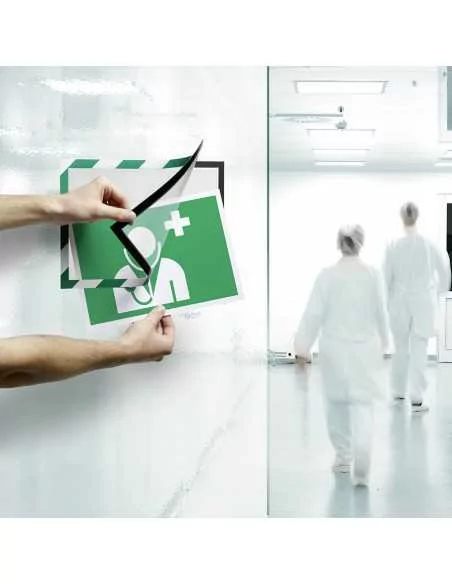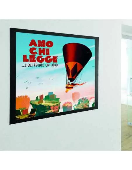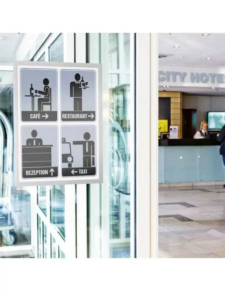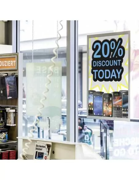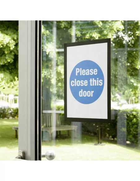 Adhesive poster holder, designed to be placed on all smooth surfaces (ideal for windows, also useful for doors, displays, panels, walls, etc). If necessary, it is easily attached and detached to choose the desired positioning. The frame is equipped with a magnetic front panel that allows you to change the print quickly and easily.