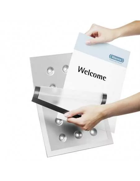 Duraframe, in addition to the adhesive version, also exists in a magnetic fixing mode for positioning on metal surfaces (f.to A5, A4 - horizontal/ vertical). On the back of the communication port instead of the adhesive there are magnetic bands. Thanks to this Duraframe system it is also possible to obtain special displays that can offer the advantages of Duraframe: