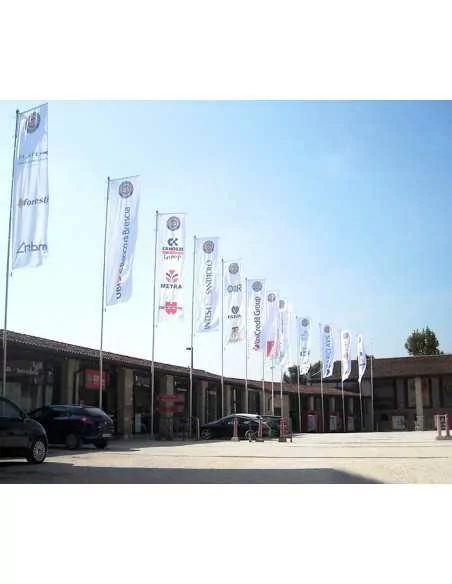 The other flag solutions (Eolo, Eolo Big, Vela, Maxivela, Goccia1, Goccia2, ...) although robust and ballasted, suitable for outdoor use, are mainly designed for temporary events and exhibitions, and must be withdrawn in difficult weather conditions.