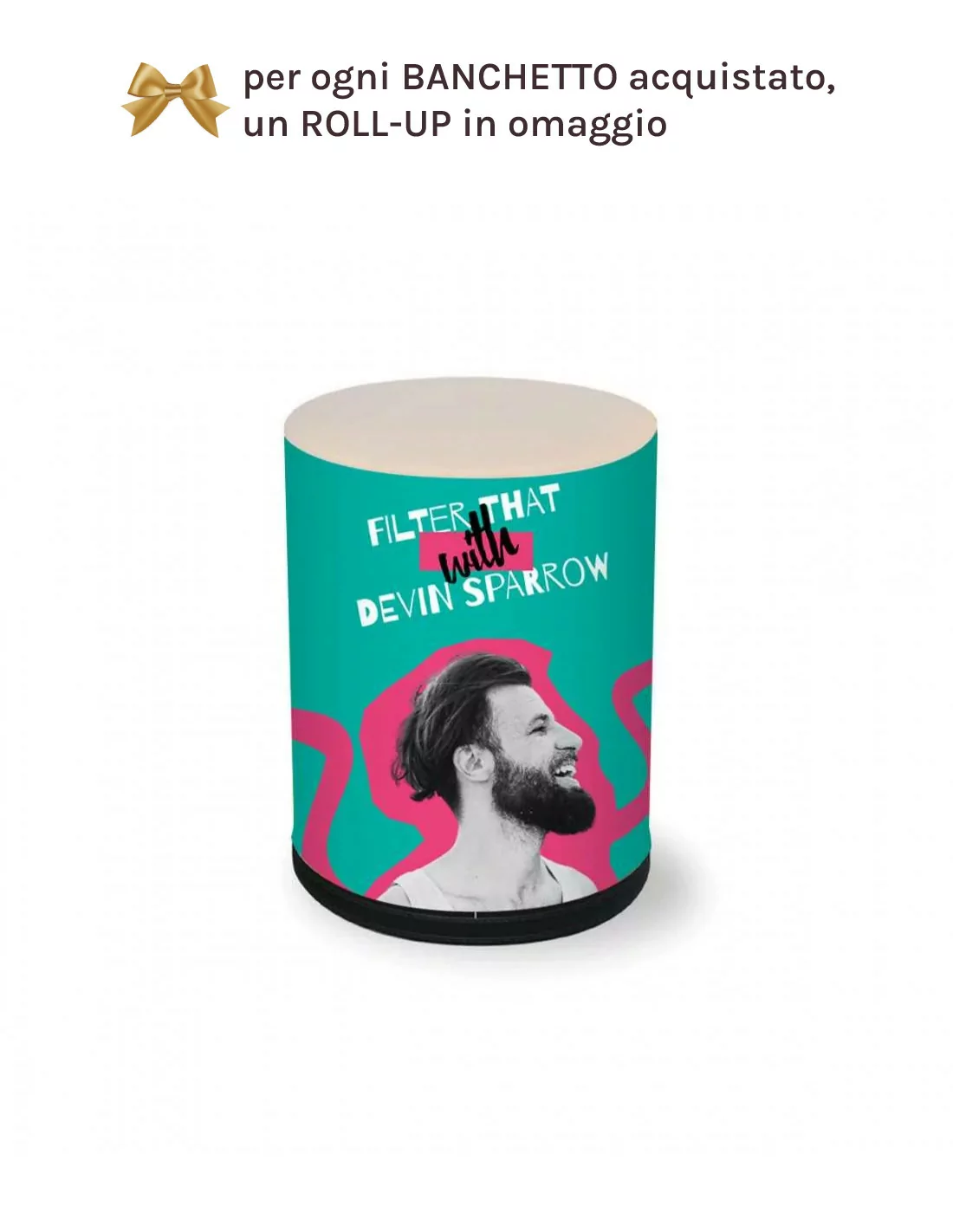 the inflatable desk has a diameter of 60cm and height of 110 cm. The customization is on elastic fabric, easy to fit as a lining, interchangeable if necessary. The graphics are attached to the banquet floors by means of a special silicone rubber sewn to the print.