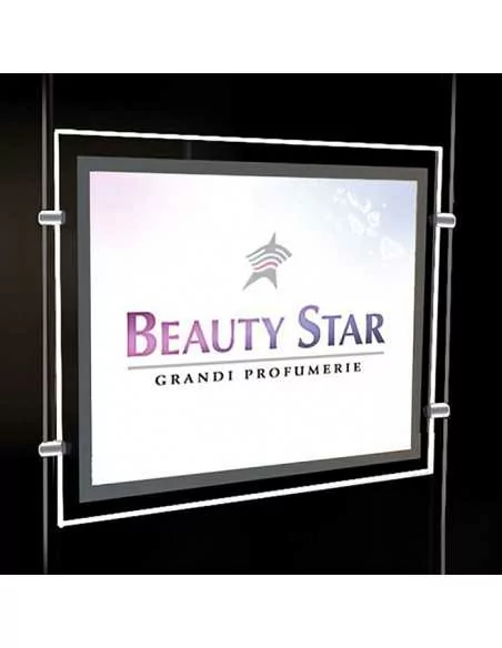 Multi-message display consisting of steel cables, to be fixed to the wall or ceiling, and for light-up windows, to be hung by means of special communication brackets in transparent plexiglas doors backlit with LED.