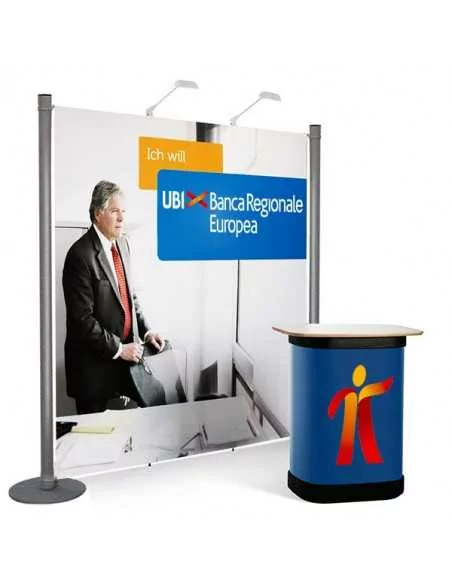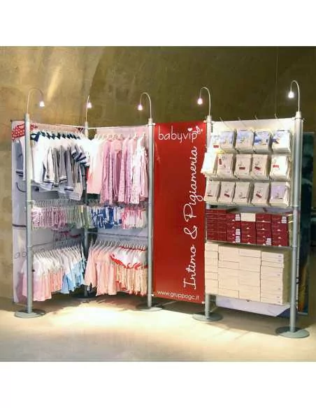 Metal floor stands that can be fitted with graphic panels (rigid or flexible) and with multiple accessories (spotlights, shelves, shelves, brochure holder pockets, TV holders, etc.) to create multiple display solutions.