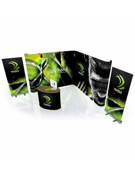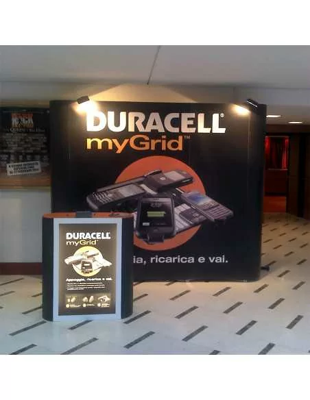 These are walls characterized by an aluminum lattice that can be closed and stored with absolute simplicity in very little space. Pop-ups are also called umbrella stands because they open/close with a simple gesture. The umbrella stands are coated with immediate graphics to be applied by magnets (on request also possibility of pop up textiles with textile prints). If the need is not that of a simple bottom but to delimit an exhibition area, it is possible to connect several walls. They come with lighting kits.