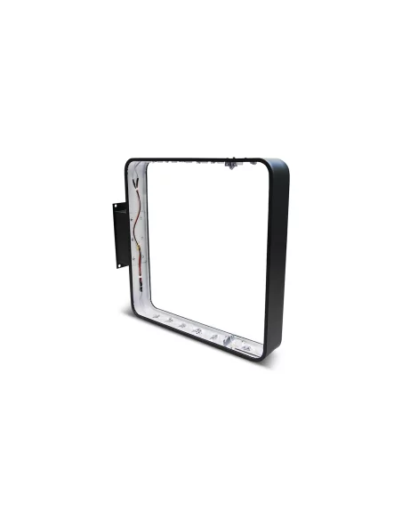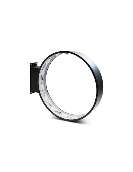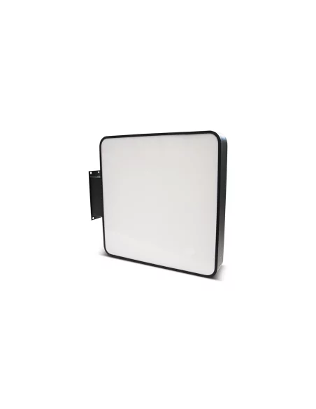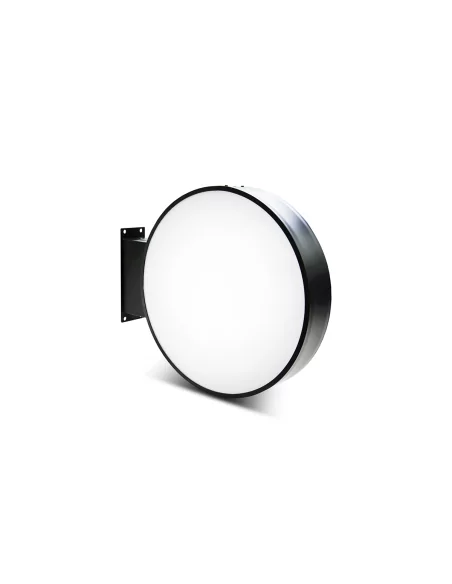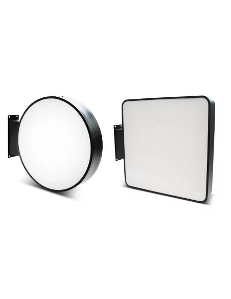 Double-sided sign , with projection from the "flag" wall, in black powder-coated aluminium. Available in round (diameter 50 cm) or square (side 50 cm). The structure, light but robust, is completed by panels in opal plexiglass. The integrated LED system provides efficient backlighting with low energy consumption, ensuring excellent visibility. Thanks to the resistance to atmospheric agents such as wind, rain and UV rays, it is suitable for both indoor and outdoor environments. The installation is simple and quick, making this solution ideal for shops, bars, restaurants and other commercial activities that need a distinctive and durable sign.