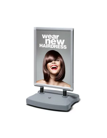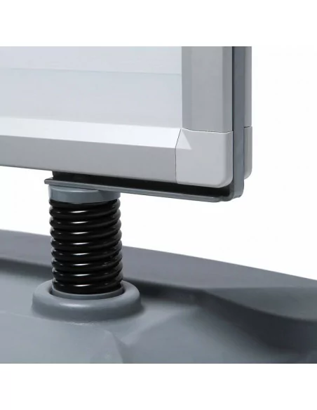Double-sided blackboard, windproof thanks to the steel springs at the base.