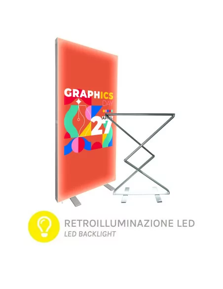 On backlight fabric, simple and quick to assemble/replace thanks to the silicone rubber to be inserted into the appropriate guide. Double-sided communication, size 100x200h cm.