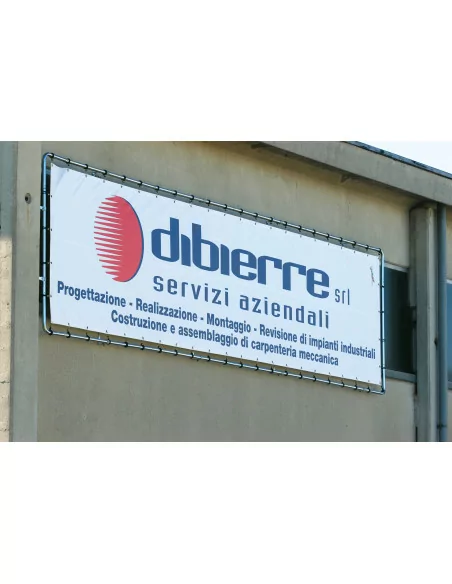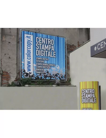 The frame is made up of 4 curves, 45 cm tubes and spacers for wall fixing. Designed for outdoor displays, ideal for installations on buildings and palaces. The system allows easy replacement of the print.