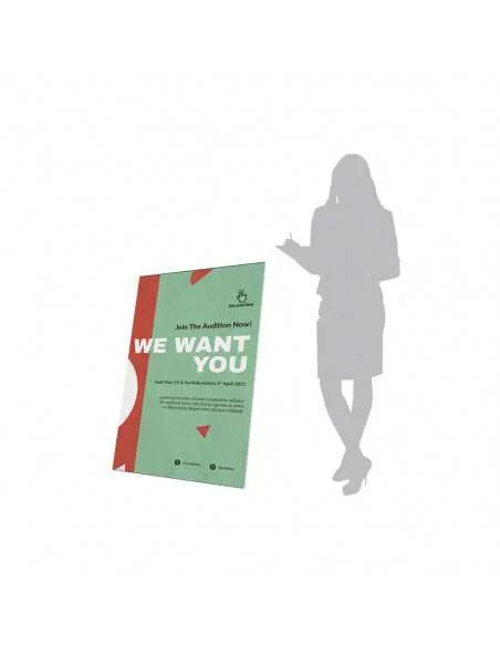 Self-supporting cardboard display, essential and economical, composed of back support in corrugated cardboard and front panel printed in microtriple cardboard. The back foot being boxed can be filled to further ballast the display. The printed panel is offered in the online configurator in sizes 100x140 cm and 50x180 cm, but on request you can also request a quote for different sizes.