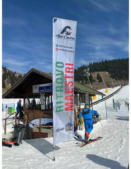 Questa bandiera pubblicitaria può essere usata anche all'esterno, zavorrata resiste a venti anche intensi (scala 6 scala Beaufort). È consigliabile ritirarla solo in condizioni meteo avverse.