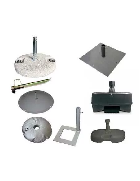 Base tonda: basamento in metallo diametro 40cm, abbinabile ai prodotti Vela, Vela Big, Goccia 2, Goccia 1 M, Goccia 1 L, Goccia 1XL, Eolo Deluxe, Goccia Deluxe, Vela Deluxe. Contrappesabile o tassellabile al terreno grazie ai fori già presenti alle estremità.