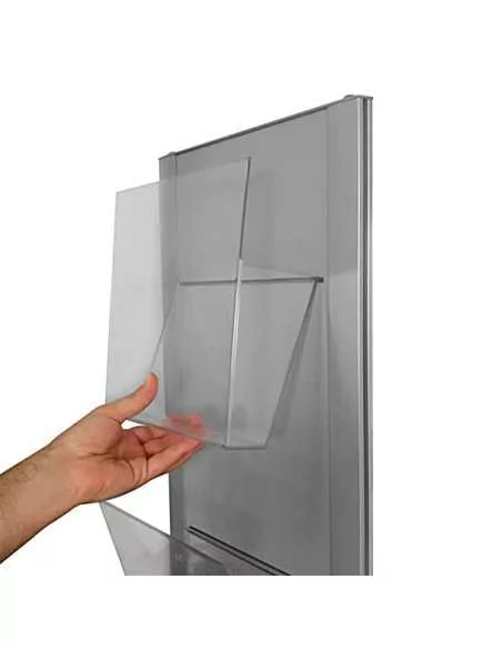 porta depliant da pavimento costituito da base in lamiera di acciaio + struttura verticale in metallo color silver da accessoriare con tasche in plex trasparente.