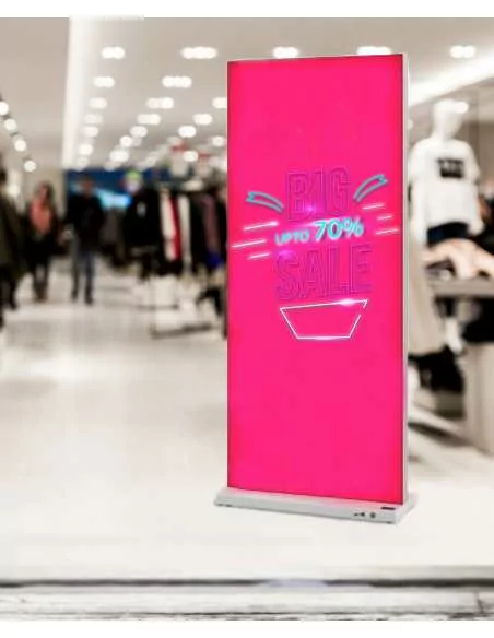 Totem, con telaio argento in alluminio textile frame, con retroilluminazione a led alimentata mediante batteria. Il lightbox (30 kg complessivi) risulta posizionato su solida base in metallo bianca (cm 100.5lx31.5px5h ), stabile e durevole anche in contesti affollati.