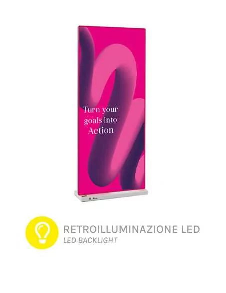 Bifacciale, realizzata su tessuto backlight cm 100x200h. Il montaggio delle grafiche risulta estremamente facile e veloce, semplicemente inserendo il gommino siliconico nelle apposite guide.