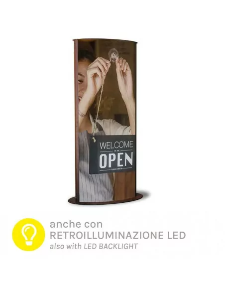 Su entrambi i totem, in caso di cambi stampa frequenti, è inoltre possibile montare una pannellatura “sandwich”: si tratta di un pannello neutro in forex (opalino per la versione led) abbinato a un secondo pannello protettivo trasparente.