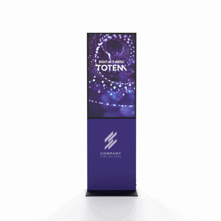 - Versione tessuto: Totem full graphic rifinito con rivestimento in tessuto perfettamente tensionato invece delle classiche pannellature (in dotazione vengono forniti teli neri sostituibili in seguito con teli personalizzati). In questa modalità abbiamo una struttura “alleggerita” ma in grado di potenziare ulteriormente il messaggio nel momento in cui, ai contenuti multimediali, si aggiungono stampe con grafiche personalizzate (da collocare frontalmente sotto lo schermo e sul retro a grafica intera). Tali decorazioni sono immediate da intercambiare grazie alla facilità di montaggio.