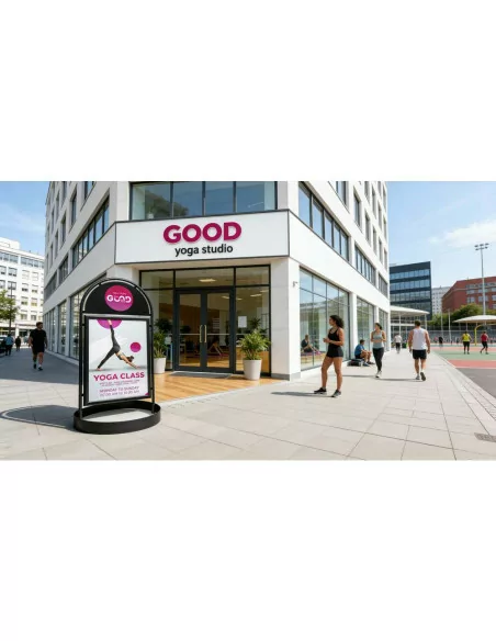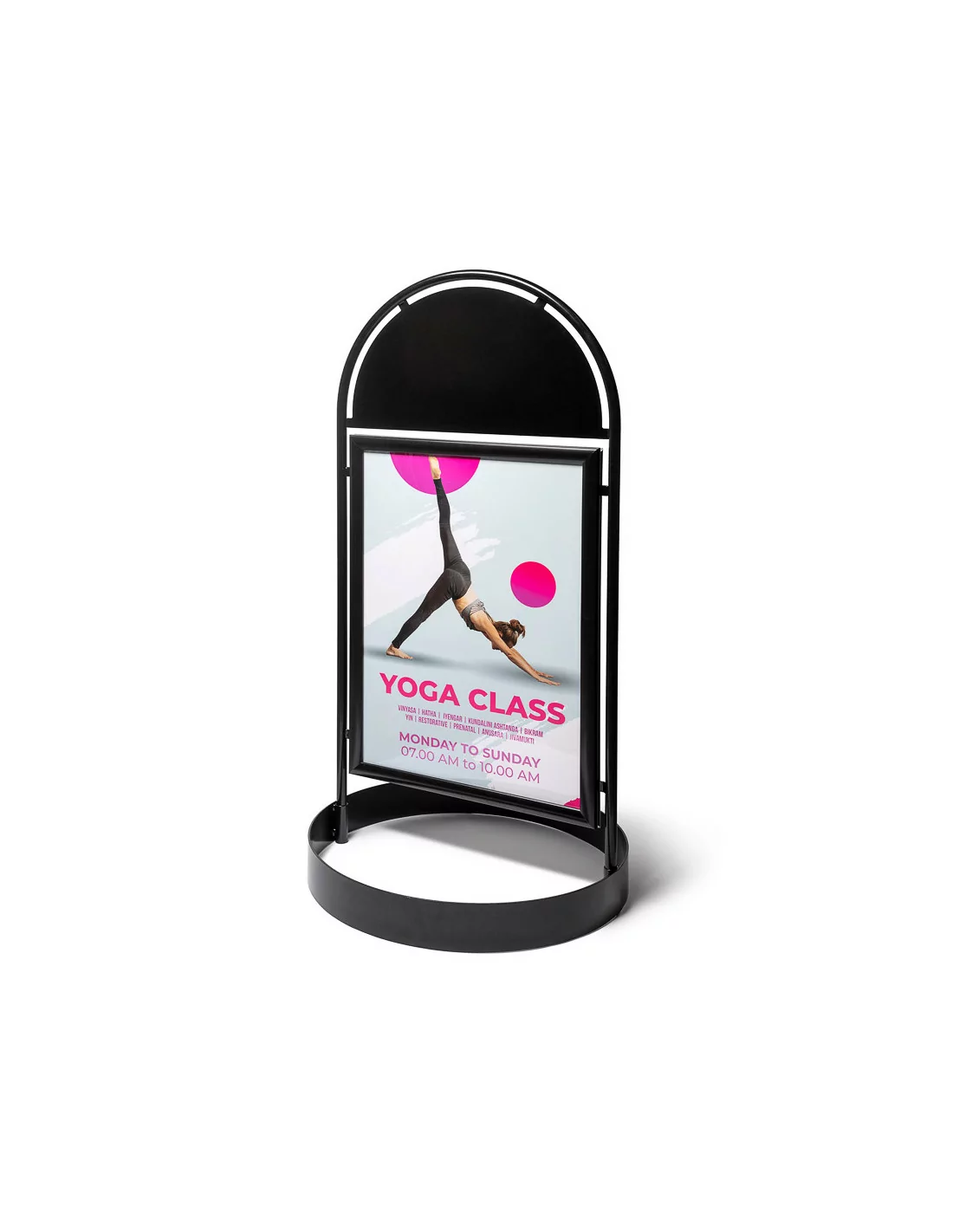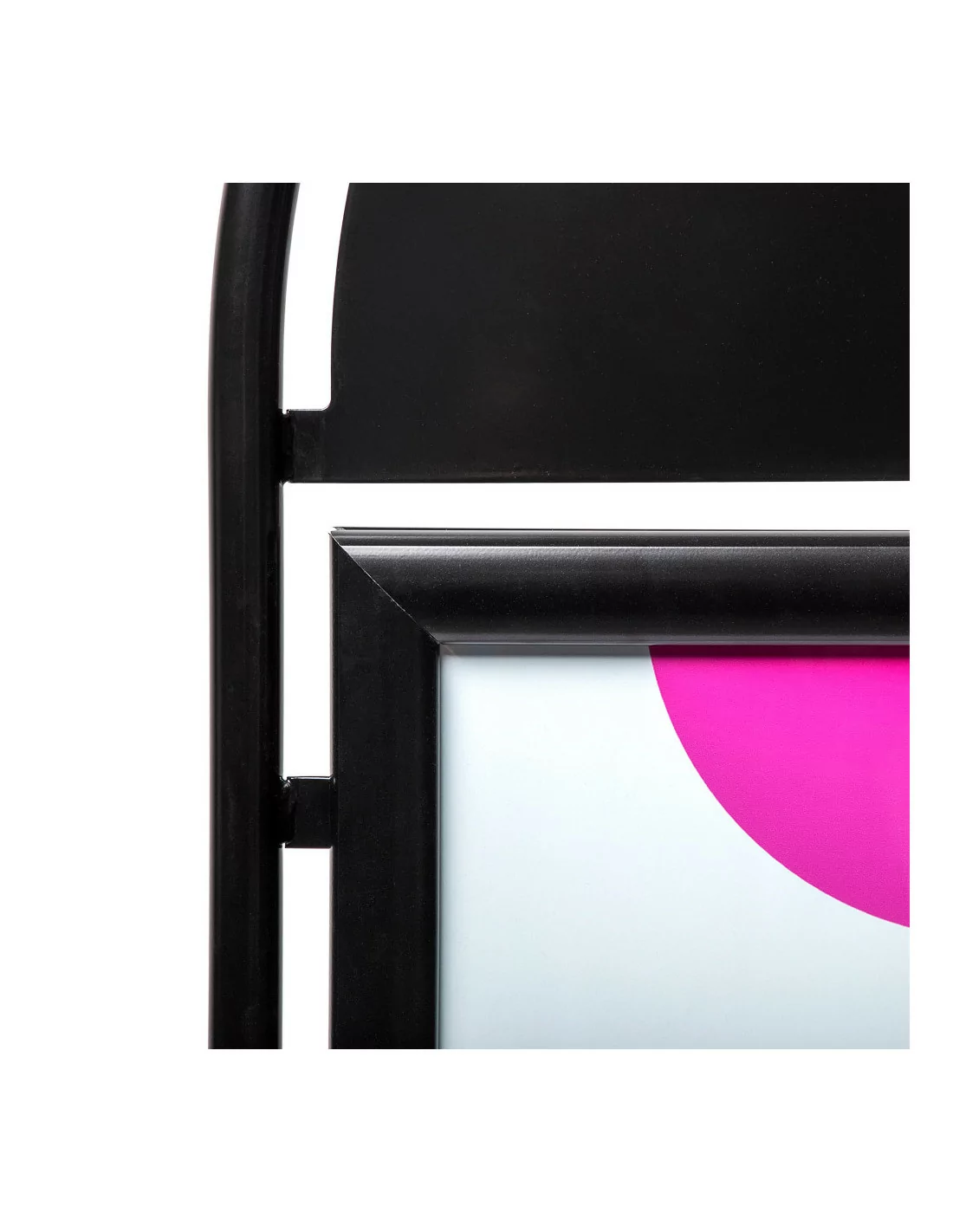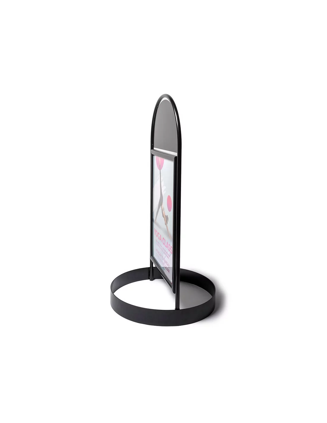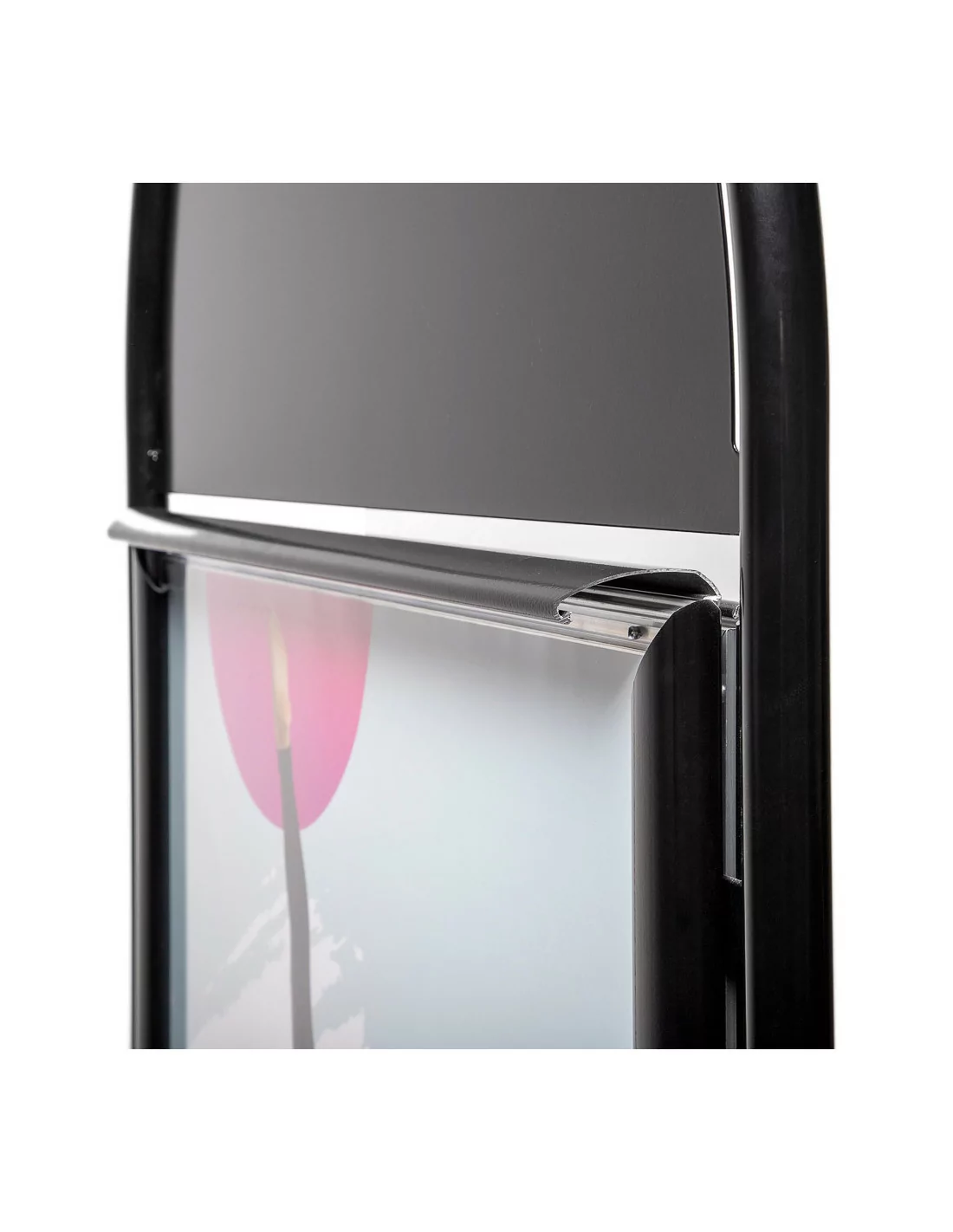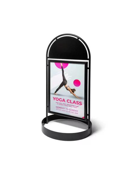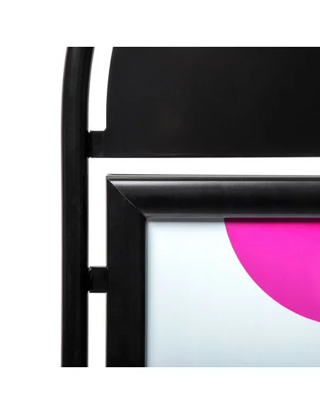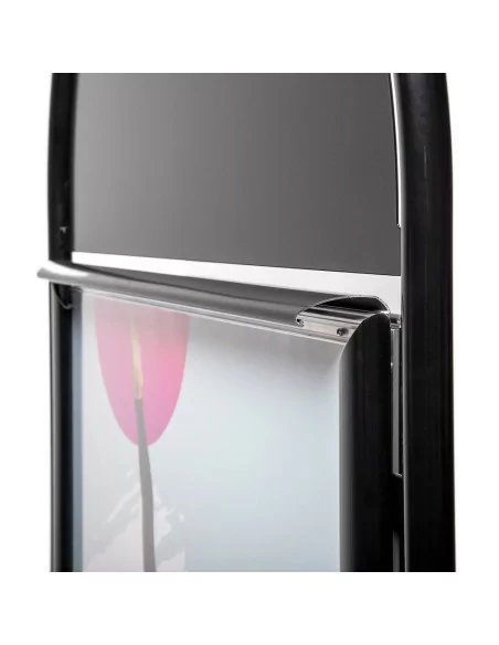 Permette di esporre poster cm 50x70 su entrambi i lati. Grafiche facilmente intercambiabili grazie alle cornici porta manifesto con profili a scatto di cui è dotato. Fornito completo di pellicola antiriflesso resistente agli UV. Possibilità di personalizzare anche la parte superiore arrotondata, per ulteriore visibilità.